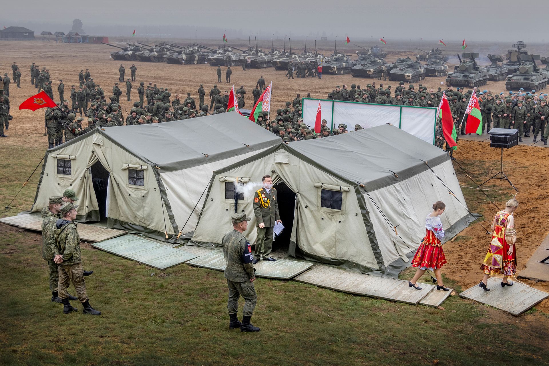 Men Eva Tedesjös bild spelar i en annan liga, den har en tyngd som de båda andra nomineringarna saknar. Jag uppfattar omedelbart att den är intressant, och dess betydelse ökar ju längre jag ser på den. Mitt primära blickfång är de två kvinnorna som är klädda i vad jag förmodar är traditionella kläder. De ser ut att vara på väg från ett tält mot en scen för att framföra ett uppträdande. Utanför ett av tälten står en dekorerad officer och röker, utom synhåll för de meniga soldaterna. Hans blick är riktad mot kvinnorna. I sin hand har han papper, som indikerar att denne man har en plan. Han styr, men visar sig inte. I bilden tycks det som om det är han som skickat ut eller sänt iväg kvinnorna, sannolikt för att höja truppernas moral. Kvinnorna går med nedsänkta huvuden, förmodligen för att se var de sätter fötterna, men effekten blir ändå att de ser på något sätt fogliga ut. Soldaterna är också fogliga. De rör sig inte som självständiga individer, utan i grupp. Kommenderade.