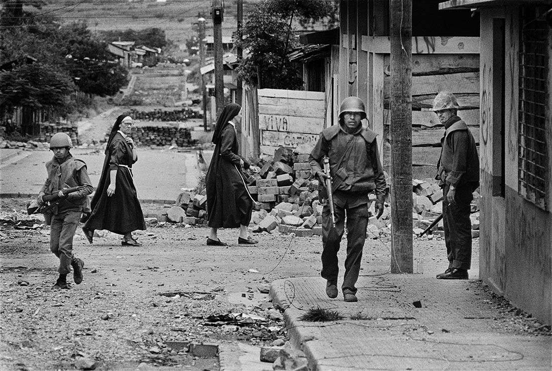 Ett av de första fotografierna han nämner ser han i en illustrerad tidskrift. Det är taget av den nederländske fotografen Koen Wessing och föreställer en gata i Nicaragua. På bilden syns tre beväpnade soldater i hjälmar, i bakgrunden går två nunnor förbi. Barthes skriver: